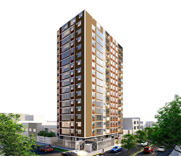 Edificio multifamiliar de 77 depas con 17 pisos más azotea y 3 sótanos.
