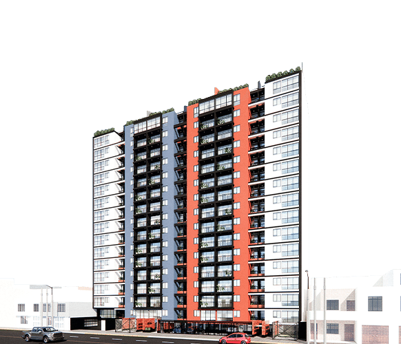 El edificio cuenta con 16 pisos y 254 departamentos de 2 y 3 dormitorios, con áreas desde 32.50 m² hasta 106.50 m², adaptados a diferentes estilos de vida. Además, incluye 86 estacionamientos para mayor comodidad.
